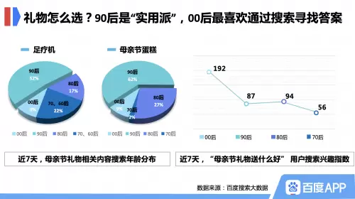 作为当下消费主力的90后选礼物走实用路线。百度搜索大数据显示,近七天搜索“母亲节蛋糕”、“足疗机”的90后占比分别达到62%和52%。而大部分还在上学的00后在选择礼物时通过百度搜索寻求答案,近七天搜索“母亲节礼物送什么好”的00后用户兴趣指数最高。