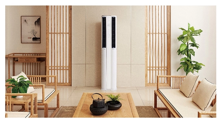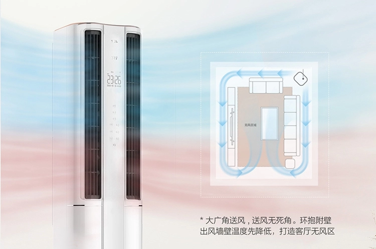通常立式的客厅空调都习惯摆放在沙发旁的墙角,而 T·睿的双出风口设计可以将冷风沿两面墙体送出,实现“环抱附壁送风”,就像是冷风将客厅包围了起来,但是中间区域却没有风。所以降温更快,同时又不吹人。