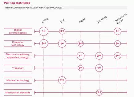 在半导体应用较为广泛的计算机和数字通信领域,中国公司的PCT申请均排于前列。报告指出,来自中国和韩国的申请者申请了大量与数字通信相关的专利,美国的申请者则集中于计算机技术领域,日本投入最重要的技术领域为电机制造,德国则是运输业。