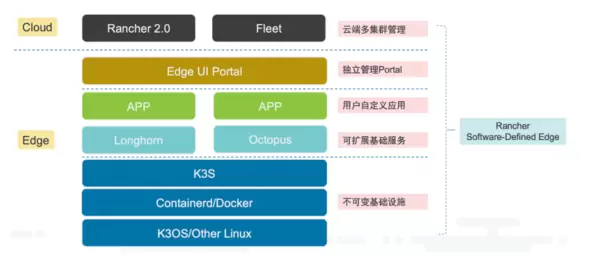 为了进一步推动Kubernetes在边缘计算场景落地,Rancher将整合K3s、K3OS、Fleet、Longhorn等关键云原生技术,正式提出“软件定义边缘”的理念,为用户提供从底层操作系统到应用编排引擎再到应用存储的开源软件方案,并将其进行整合优化,从而帮助用户轻松应对边缘场景的挑战。