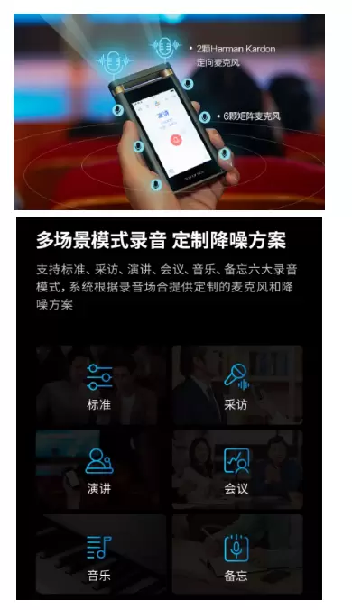 讯飞智能录音笔的产品实力突围,首要原因是在硬件配置方面的“硬核”:,讯飞智能录音笔配有2颗大直径哈曼定向麦克风及6颗矩阵麦克风,调动8个麦克风的矩阵组合更是出彩,能在会议、采访、演出、音乐会等不同录音场景下,实现最远15米的拾音以及360度环绕无死角收声。讯飞智能录音笔降噪和拾音技术都比较强悍,配备多麦克风阵列,配合智能拾音降噪技术,采用多种录音模式,满足远距离高清拾音需求,远距离拾音能记录每一条消息。