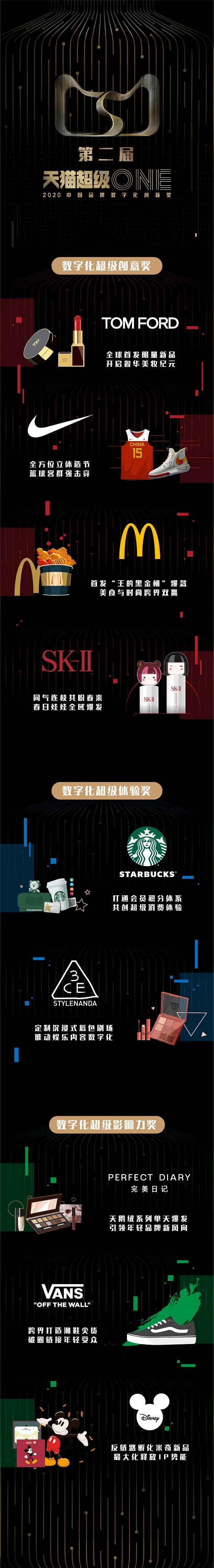 其中,麦当劳、NIKE、SK-II、TOM FORD荣膺数字化超级创意奖,星巴克、3CE拿下新消费超级体验奖,米奇、完美日记、VAN则斩获了新商业超级影响力奖。它们既是天猫超级品牌日在全面数字化转型上的默契伙伴,更是在寻求营销创变上持续突破的先锋力量。