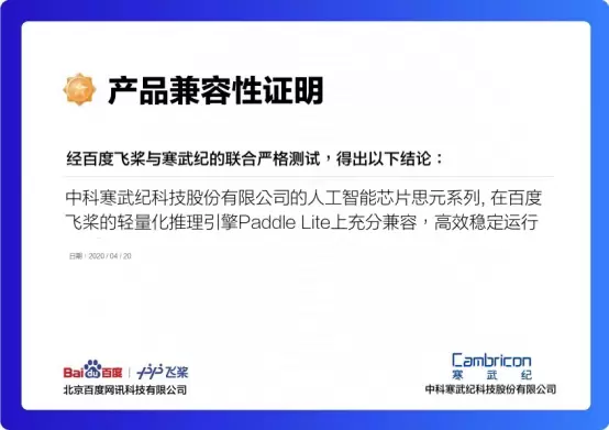 百度飞桨与寒武纪兼容性认证书