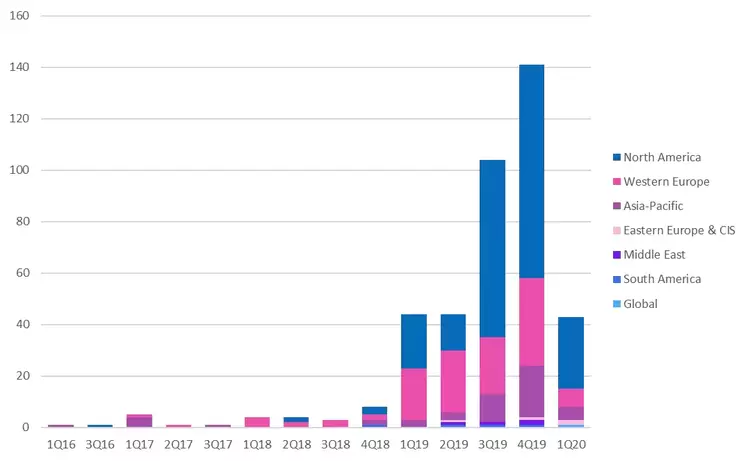 Figure 1: Private network activity count, by region, 2016–1Q20