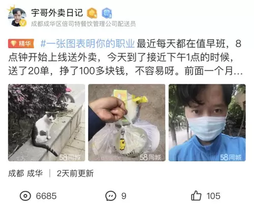 围绕外卖员的日常工作,58部落还汇聚了#我是外卖员,这是我的一天#、#做一名外卖员是什么样的体验?#等话题,58部落天津网友@外卖小哥崔晨 介绍,自己在零下十度的气温下给客户送餐,电动车被风吹倒,里面的其它餐食撒了出来。这名外卖小哥请餐馆老板重新做一份,自己来付钱,但老板并没有让他赔钱,还给了他一碗热乎乎的紫菜蛋花汤,这让外卖小哥倍感温暖。58部落用户@外卖百晓生 分享了从事外卖行业的经历,从单纯的自配送,到平台骑手、站长、城市经历,再到加盟商负责人,他对整个外卖行业十分了解。他表示,外卖员很辛苦也比较孤独,但风雨过后见彩虹,外卖行业也有美好的未来。