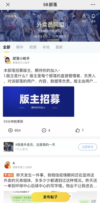 作为58同城旗下的优质内容社区,58部落汇聚了外卖、快递、客服、导购、幼师等不同行业的部落圈子,吸引全国各地职场人分享工作经历、交流心得感悟。关于外卖行业,58部落有专门的“外卖员同盟”,网友们围绕外卖员的日常工作、薪资待遇、必备技能等进行讨论,目前已经发布帖子3.9万个,吸引了286万人次访问。