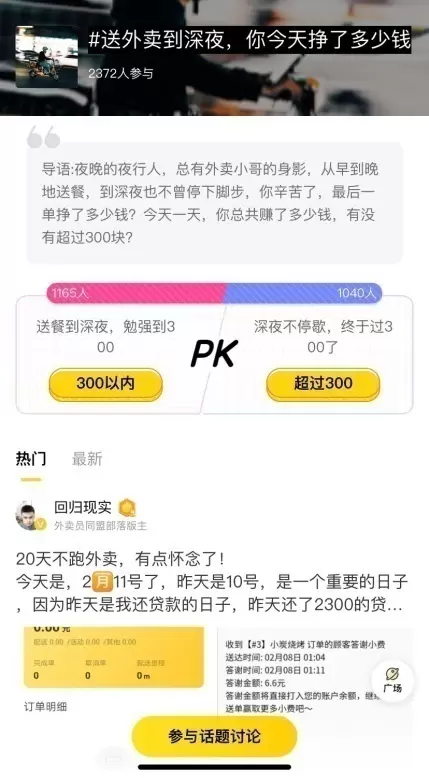 针对用户关心的收入问题, #送外卖到深夜,你今天挣了多少钱#话题引发讨论。58部落网友@淡写青春 介绍,自己从深夜11点半到凌晨3点半,共跑了15单,挣了105元,觉得非常幸运。58部落用户@西安漂泊小哥 表示,自己更喜欢跑夜单,单价高、抢单的外卖员少、路上车少行车安全,深夜送外卖性价比其实挺高。