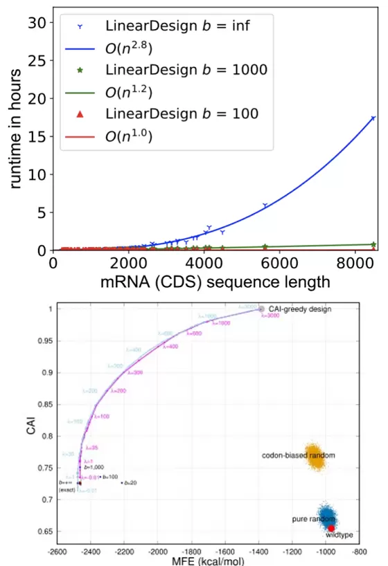 LinearDesign算法解决了这一“世界性”难题。它是应用计算机科学领域经典算法——动态规划算法,来将这一问题的搜索时间从亿万亿年降低到分钟级。在新冠病毒的刺突蛋白序列上的计算机模拟实验表明,LinearDesign能够设计出结构最稳定的序列,而且设计时间只需要1个半小时。如果采用线性时间近似算法,所需时间可以进一步缩短到16分钟, 而与最优解的能量差距(衡量稳定性的指标,能量越低越稳定)只有0.6%。这两种设计相比于自然界天然存在的新冠病毒刺突蛋白mRNA序列要稳定的多(能量降低了150%)。