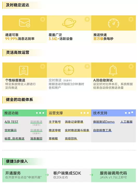 此外,OPPO PUSH还提供了主子账号、推送审核、草稿箱、消息记录管理、实时推送漏斗报表和消息回执等多方面的运营支撑,以及包括体验测试demo、自助排查工具、人工客服等在内的技术支持。值得注意的是,其接入方式也十分简化,开发者只需三步:开通服务-客户端集成-服务端调用代码,即可实现快速接入。