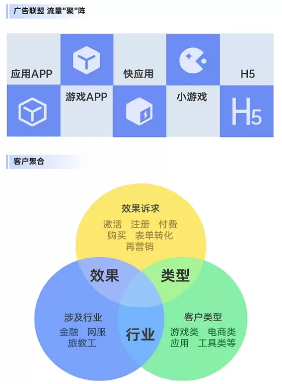 客户聚合主要表现在丰富的客户结构上,涵盖了包括游戏类、电商类、应用/工具类等不同类型的客户,以保证快速填充和展现多样化。