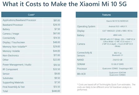 旗舰杀手们在硬件配置上如何进行取舍,不妨先来看看此前TechInsights给出的已知的两款机型的BOM成本单,分别为超级旗舰级别的代表Galaxy S20 Ultra,另一款为旗舰杀手级别的代表小米10。三星S20 Ultra的整机物料成本为528.50美元,其中最贵的零部件为相机,成本107.50美元,其次为81美元的骁龙865,第三为67美元的屏幕。小米10的整机物料成本为440美元,其中最贵的零部件为81美元的骁龙865,其次为相机部分67美元,第三是屏幕部分48美元。