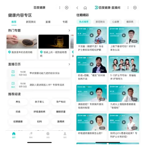 为满足健康领域专业作者的多元化创作需求,百度健康提供了包括视频、直播、图文、问答、动态等在内的内容创作形态,有利于推动创作者更加“自由”地生产优质内容,以权威、全面的医疗健康知识全场景触达、连接用户。其中,百度健康直播间面向医疗健康各领域权威专家开放直播席位,并提供精准的患者匹配,构建与网友实时互动的平台。疫情期间,百度健康直播间邀请权威医学专家和一线医务人员通过直播的形式分享前线抗疫经验,累计完成超过200场新冠科普直播,为超过5000万用户带来最前沿的科学防护知识。