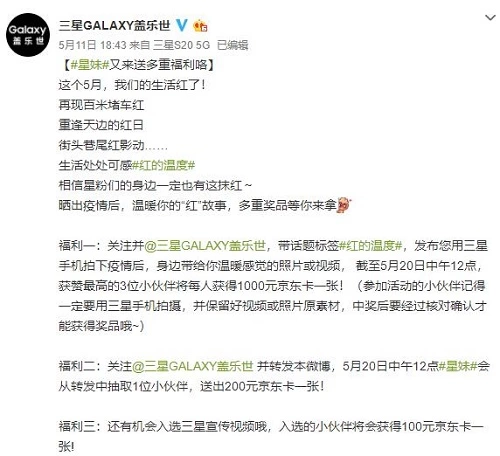 如此看来,馥郁红出众的颜值自然不必赘述,但是从微博@三星GALAXY盖乐世的配文“这个5月,我们的生活红了!再现百米堵车红,重逢天边的红日,街头巷尾红影动,生活处处可感#红的温度#,晒出疫情后,温暖你的红故事”,可以看出此时此刻推出的这款馥郁红寓意颇深。或许正是因为在疫情的阴霾缓缓散去,五月的阳光温暖人心之际,三星希望借助Galaxy S20+ 5G馥郁红色的美好寓意,以“Sunny20红的温度”的主题同中国用户共赴美好的新生活。