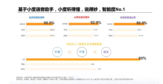 此外,小度背靠百度行业领先的人工智能技术,为用户带来的卓越使用体验,也让交互次数不断攀升。在中科院《智能音箱的智能技术解析及其成熟度测评》报告中,小度是唯一听懂率超过90%的产品,在满足用户需求和体验的产品满足率方面同样拔得头筹,用户满意度最高。优秀的使用体验带来了高频的用户交互,2019年12月小度第一方硬件语音交互次数就达到了23亿次,是去年同期的七倍多。