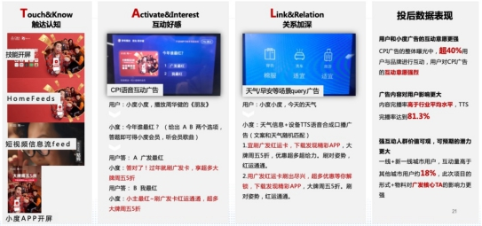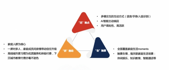 满足了家庭场景营销的入口问题,接下来要思考如何实现对用户高频率、高粘度、高交互的触达。单纯的对话和浏览已不能满足当下品牌营销的需求,小度从活触点、全触景、亲触动三大维度深入家庭场景,帮助品牌形成深刻有效的用户认知。