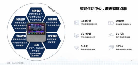同时,小度丰富的产品功能全时全景覆盖家庭生活,是品牌植入的绝佳场景。在产品功能上,小度为用户提供休闲娱乐、知识教育、问答资讯、生活服务、社交通讯等,覆盖家庭生活点滴,而用户每日平均使用次数更是高达30+次,平均观看长视频时长达到158分钟,平均观看短视频时长达到69分钟。