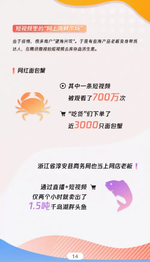 腾讯微视方面,在广东省农业农村厅指导下,2月中旬腾讯微视联合味库海鲜搭建短视频里的“网上海鲜市场”,以零利润帮卖滞销海鲜。截至目前,其中一条短视频播放量超过700万,卖出面包蟹近3000只。3月8日,浙江省淳安县商务局在腾讯微视上开启了千岛湖胖头鱼销售直播,仅仅两个小时,就卖出1.5吨。