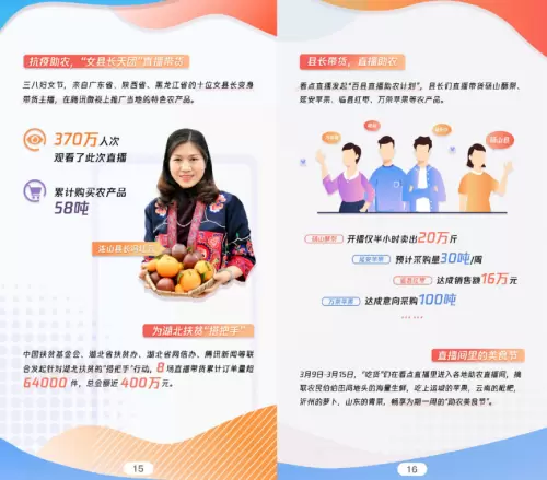 3月8日,来自广东省、陕西省、黑龙江省的十位女县长也亲自出镜直播,推广当地的特色农产品,共有370万人次在线观看,直播累计售出农产品58吨。
