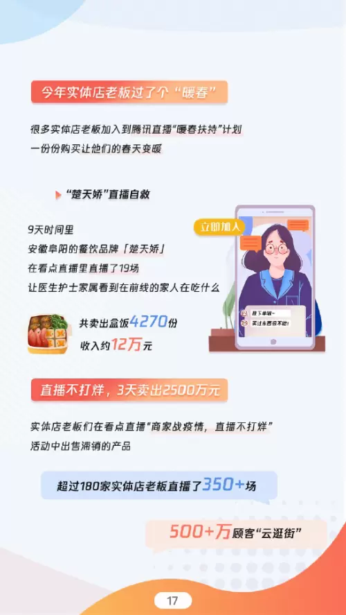 2月14日-16日,看点直播又发起“商家战疫情,直播不打烊” 商家共发起350场次直播,总观看人数突破500万,三天实现直播总销售额2500万。为进一步帮助线下实体商户顺利开启线上直播,腾讯直播发起“线下实体商户暖春扶持”计划,通过一对一专业指导、电商直播培训、营销扶持等多项政策,助力线下实体商户向线上转型。