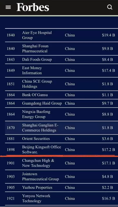上市仅半年,金山办公跻身福布斯全球企业2000强