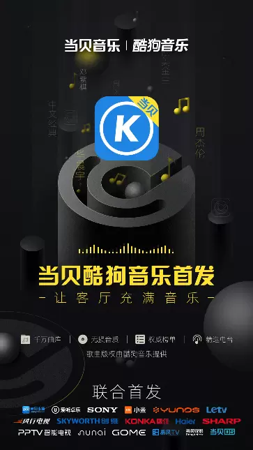 即日起,当贝酷狗音乐将在当贝市场、索尼、小米、阿里YunOS、乐视、风行、创维、康佳、海尔、夏普、PPTV、芒果牛奶OS、国美GOME、暴风TV、当贝投影、当贝OS等平台首发上线。