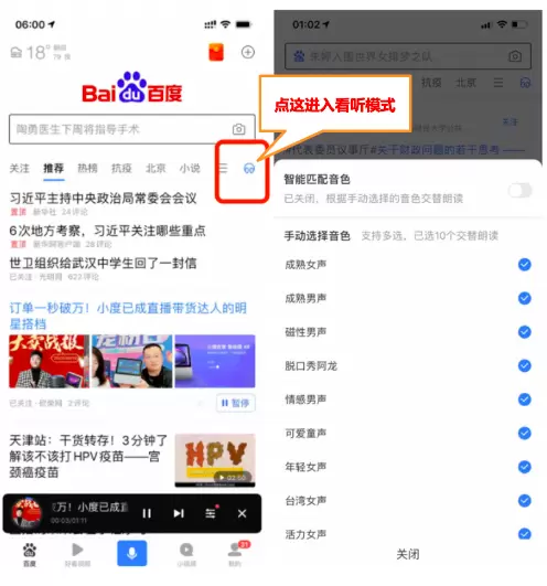从使用体验看,目前,百度App看听模式可以为用户提供10种声音,活泼可爱,深情磁性等各种风格应有尽有。无论是哪种风格,朗读节奏都十分流畅,几乎与真人说话无异。此外,百度App看听模式中,还有一个亮点功能,即朗读时用户可以选择通篇朗读或者提取资讯中的核心进行播报。这种多样化的选择,显然也更容易赢得用户好感,巩固与用户之间的沟通纽带。