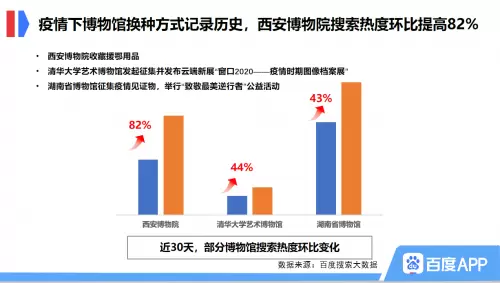 在全民抗疫的时代背景中,博物馆也发挥自身优势,记录这段特殊的历史。其中西安博物院收藏了陕西援鄂医疗队的的抗疫见证物品,搜索热度近30天环比上涨82%。清华大学艺术博物馆举行云端新展“窗口2020——疫情时期图像档案展”;湖南省博物馆收藏疫情见证物品,并特地设计了寓意爱与温暖的“心满樱”文创产品;湖北省博物馆收藏了红遍社交网络的“武汉网红窗帘”,上述博物馆的搜索热度均有不同程度的上涨。