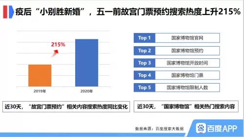 “闭关”三个多月的博物馆虽然重新开放,但大多数实行预约、错峰、限流参观。有限的参观人数无法满足人们被抑制了三个多月的热情,博物馆预约迎来一波“小别胜新婚”。百度搜索大数据显示,近30天,“故宫门票预约”相关内容搜索热度同比上升215%,“国家博物馆”的相关热门搜索内容分别为官网、预约、开放时间、限制人数等。