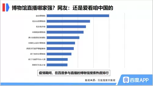 从百度直播平台的数据来看,中国本土博物馆的直播热度明显高于海外博物馆,热度排行榜前五的分别为故宫博物院、北京自然博物馆、北京海洋馆、中国地质博物馆、澳大利亚悉尼歌剧院,仅有一家来自海外。