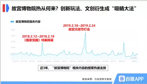 百度搜索大数据还揭示了故宫博物院修炼成博物馆界的“超级网红”的秘密:除了自身的传统优势,故宫博物院近年来开发不少创新玩法,如和《国家宝藏》合作特展、举办故宫元宵节灯会等等,均为故宫博物院带来搜索热度的飙升。