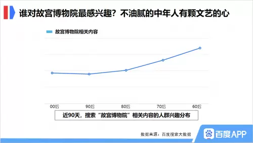 谁对故宫博物院最感兴趣?据百度搜索大数据显示,近90天里搜索故宫博物院相关内容的人群中,年龄越大的兴趣越高,故宫对60后、70后的吸引力更大,不油腻的中年人也有颗文艺的心。