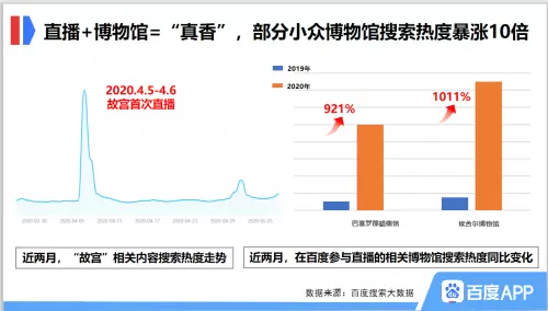 疫情和隔离催生了“直播热”,文博行业也乘着直播的东风,收获了社会各界的热烈反响。作为闭馆期间博物馆提供文化服务的一种新方式,直播已成为文博行业数字化发展的新趋势。百度搜索大数据显示,近两个月,“故宫博物院”相关搜索内容的波峰就出现在故宫首次直播之中。此外,海内外各大博物馆在百度的直播,也将大量优质博物馆带到网友面前,部分小众博物馆因此搜索热度暴涨,其中“巴塞罗那蜡像馆”搜索热度同比上涨921%,“埃舍尔博物馆”搜索热度同比上涨1011%。