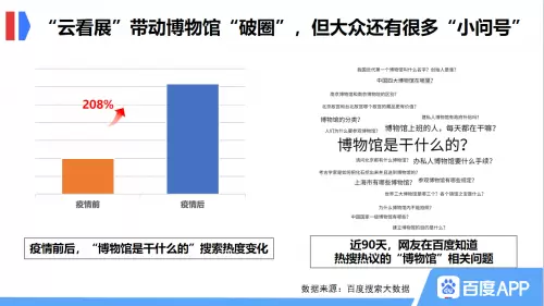 博物馆和直播的结合,被网友们亲切地称为“云看展”。“云看展”不仅满足了对文博知识有需求的人群,更将博物馆带到了更广泛的人群中,形成了一次“破圈”。百度搜索大数据显示,“博物馆是干什么的”这个问题较疫情前搜索热度上涨了208%。此外,近期网友在百度知道上热搜热议许多博物馆的话题,包括“博物馆上班的人,每天都在干嘛?”“办私人博物馆要什么手续?”“为什么博物馆内不能拍照?”等,直播令更多的人对博物馆产生兴趣。