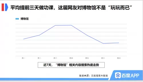 参观博物馆是一时兴起的行为吗?百度搜索大数据的答案是否定的。博物馆相关内容的热度在每周三、四达到峰值,周末则是低谷。百度搜索大数据表明,人们去博物馆参观前,往往会提前三天左右做功课,对博物馆的基本信息以及历史、藏品、看点等进行全方位的了解。这届网友对博物馆可不是“玩玩而已”。