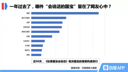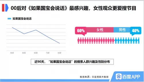 想了解我国的珍贵文物,除了亲身参观博物馆和在百度“云看展”外,许多网友也会选择观看制作精良的节目。《如果国宝会说话》就是这样一档节目,由国家文物局和中央电视台共同制作的节目短小精悍,每集仅用5分钟介绍一件知名国宝,“短平快”的节奏在00后中大受欢迎,同时也吸引了更多女性观众的搜索和关注。