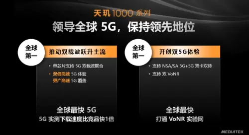 考虑目前5G基站数量并不多,手机的信号接收能力直接决定网速体验,天玑1000Plus支持全球领先的 5G 技术,包括 5G 双载波聚合,创造全球最快Sub-6上下行速率,是全球第一且目前业内唯一支持5G+5G双卡双待的芯片,让用户时时尽享5G高速连接,5G信号的稳定,极其影响使用体验,这一点,MediaTek真正有帮助到客户做到体验升级。