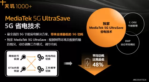功耗方面,天玑1000Plus搭载 MediaTek 5G UltraSave 省电技术,可根据网络环境及数据传输情况,动态调整调制解调器的工作模式,包括电源配置和工作频率等,结合 BWP 动态带宽调控、C-DRX 节能管理,平均功耗较同级竞品低 48%,成为全球最低5G功耗,有望彻底解决重度用户的“电量焦虑症”,且给手机厂商提供了更广泛的产品设计空间。