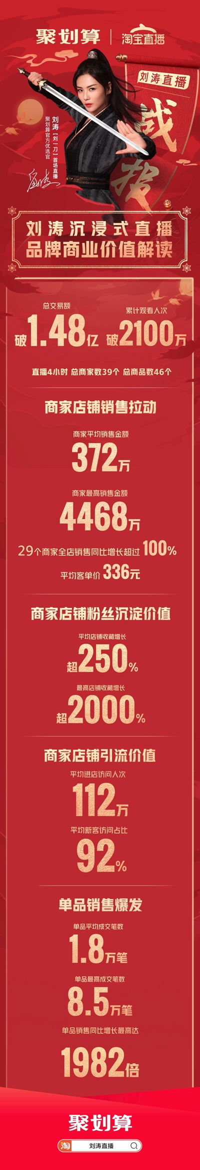从目前聚划算对外公布的数据来看,5月14日晚刘涛聚划算直播间成交总金额已破1.48亿,观看人次超2000万,商家平均销售金额达到372万,单品销售同比增长最高达1982倍。对于首次在聚划算直播间开播带货的刘涛而言,无疑是一份堪称完美的答卷。