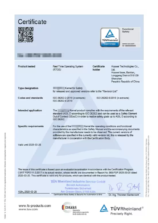 在无先例可借鉴的情况下,华为经过多轮交付件评审、现场审核、专家终审,通过机构的层层审核,获得TÜV莱茵ISO 26262认证证书。得益于该内核的细粒度解耦架构、形式化方法和确定性时延机制等优势,华为获证周期相比行业缩短了1年,得到了认证机构和发证官的高度评价。