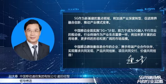 中国移动赵大春副总经理为本次会议发来寄语,提到中国移动愿做最容易合作的企业,携手终端产业合作伙伴,实现需求共同发现、产品共同创新、项目共同交付、价值共同创造!