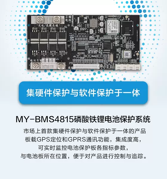 最后一款产品BMS4815磷酸铁锂电池保护系统,是市场上首款集硬件保护与软件保护于一体的产品,板载GPS定位和GPRS通讯功能,集成度高,可实时监控电池保护板各指标参数,与电池板所在位置,便于对产品进行控制与追踪。