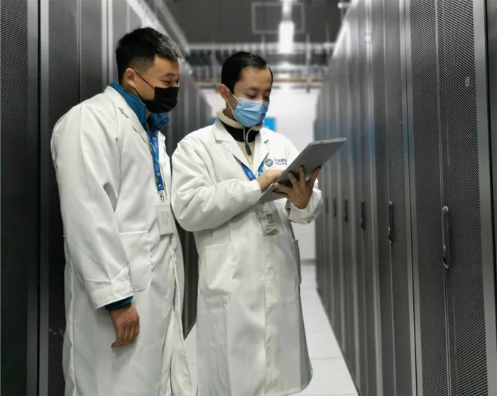 中国移动(襄阳)数据中心,网络工程师在新型绿色仓储式数据中心工作