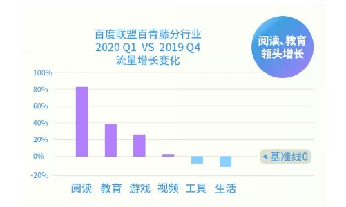 近日,针对疫情影响下广告行业市场发展情况,百度联盟发布了2020年Q1行业流量分析与洞察报告。数据显示,2020年Q1百度联盟百青藤媒体流量实现环比增长,新增行业头部媒体伙伴约100家。在细分行业,阅读、教育、游戏类等细分行业增幅位列前三,分别达到了超80%、35%、20%的流量增长。值得注意的是,春节过后PC领域流量迅速恢复,整体走势超出预期,联盟媒体伙伴可以加强布局聚合更多流量。
