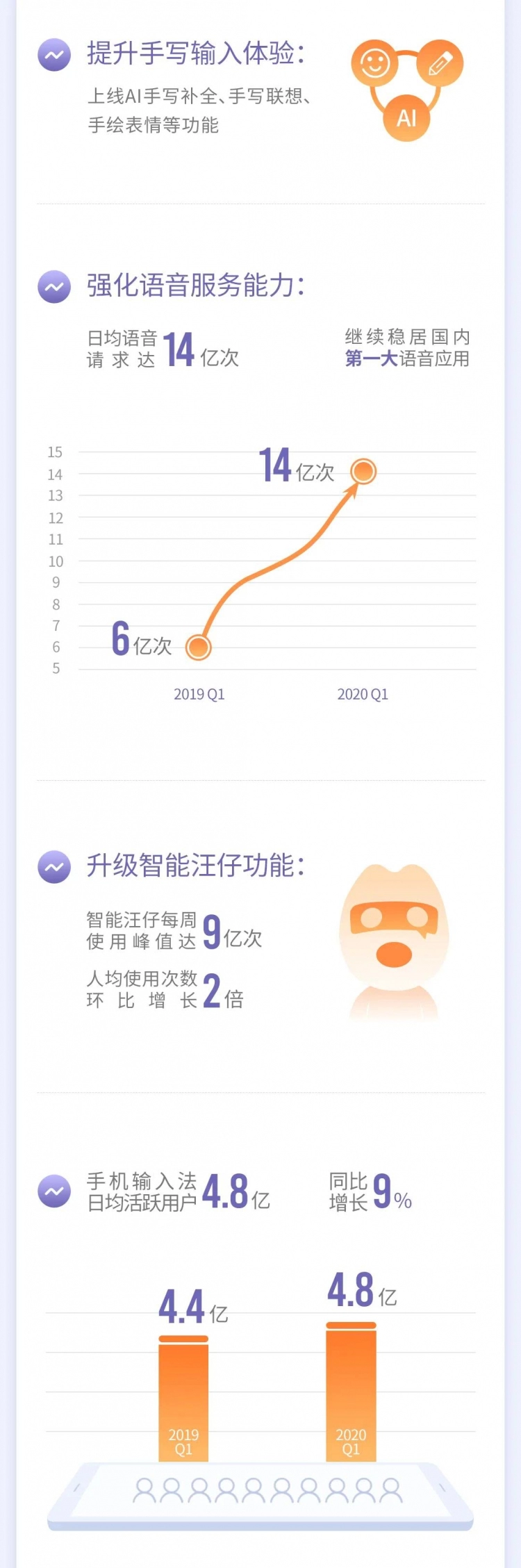 结合搜狗财报,第一季度搜狗手机输入法DAU(Daily Active User,日活跃用户数量)达4.82亿,同比大幅增长9%,日均语音请求峰值达14亿。
