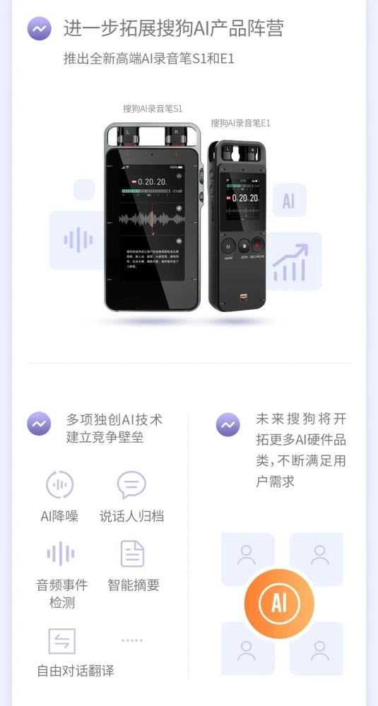 搜狗布局智能硬件的发展始于2014年底。彼时,搜狗发布了糖猫儿童智能手表,集成语音对讲、定位、体感游戏等基础功能,截至2017年销量突破100万台;2019年搜狗推出C1/C1 Pro入局录音笔市场,发布当日销量突破2万台。