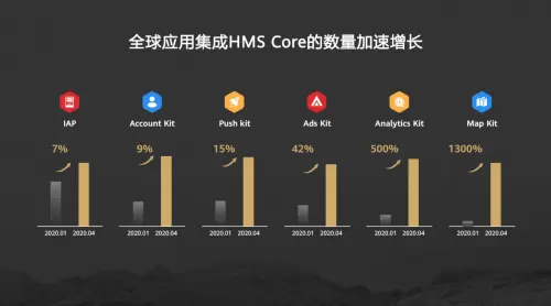 在全球分析师大会消费者业务分论坛上,谭东晖也介绍了HMS Core 4.0的集成进展情况。截至2020年3月,全球接入HMS Core的应用数量超过6万,同比增长67%,其中地图服务的集成数量增长更是达到了1300%,增长速度惊人。