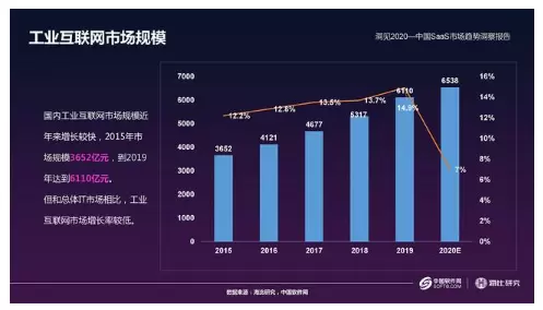 疫情是推动SaaS产业发展的催化剂,中国软件网总裁、海比研究总裁曹开彬表示,制造行业在IT、信息化或者数字化方面的投入有非常大的增长,但制造业公有云投入低于平均水平,传统架构仍然占据2019年制造业的投入54%,SaaS占制造业公有云的30%左右。与此同时,国内工业互联网市场规模近年来增长较快,即将突破7000亿元。工业互联网正在经历导入期,即将进入快速发展期。