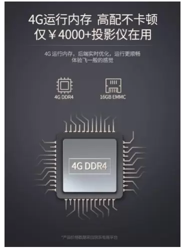 内存作为投影仪操作系统和运行中的程序临时数据存储媒介,容量越大可同时运行的程序就越多,并能在多个应用程序间快速切换。腾讯极光投影T5的运行内存选用了4GB DDR4,DDR又称双倍速率SDRAM,最高频率可达3000MHz。在提升速率和规格的同时,功耗却变得更低,避免因功耗过高,而引起的机体发热问题。并为运行的稳定性及顺畅性,提供了强有力的保障。配以16G的强大物理存储空间,断网追剧也毫无压力!