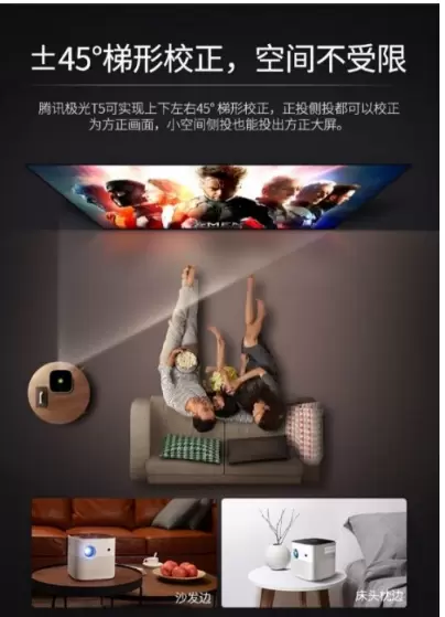 人性化的设计,是一款产品能否赢得用户肯定的重要细节。繁琐的操作会降低使用体验及好感度。腾讯极光投影T5进行了一系列的人性化功能设计,内置智能传感器及全自动对焦摄像头,可实现全局实时自动对焦,画面即刻清晰呈现。配以±45°梯形自动校正功能,让投影空间不再受限,让手残党不再挠头。