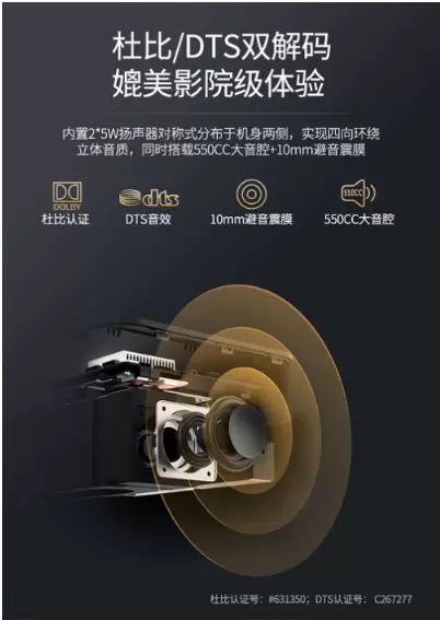 音响也是消费者购买时应重点考虑的模块,高品质的音质可令观影更具有沉浸感。因此,音响配置是否“豪华”就显得尤为重要。腾讯极光投影T5内置两枚10W扬声器,以对称式分布于机身两侧,同时搭载550CC大音腔和10mm避音震膜发音单元设计,令音质更加浑厚饱满,临场感更强。杜比和DTS双解码音效的加持,带来更浑厚的低音与更细腻的中高音,令你全方位沉浸式体验Hi-Fi音质魅力。当影像与声音达到完美结合,影院级的音画效果在家就能享受。